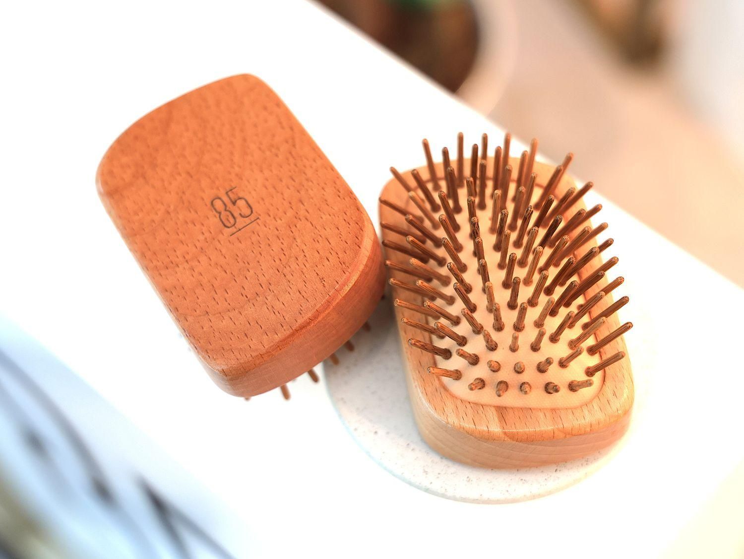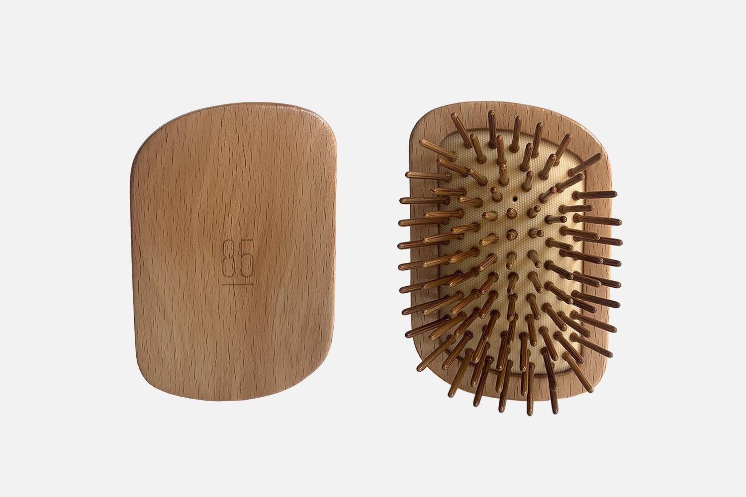 朝と入浴前のブラッシングは、頭皮や髪を健康に保つだけではなく、お顔のリフトアップにも効果が期待できます。85は、毎日使いやすい形状と素材にこだわりました。ブラシは面にしっかり力が伝わるホールドタイプ。ピンの部分にも木材を使った、頭皮にやさしく心地よい刺激を与えるブラシです。