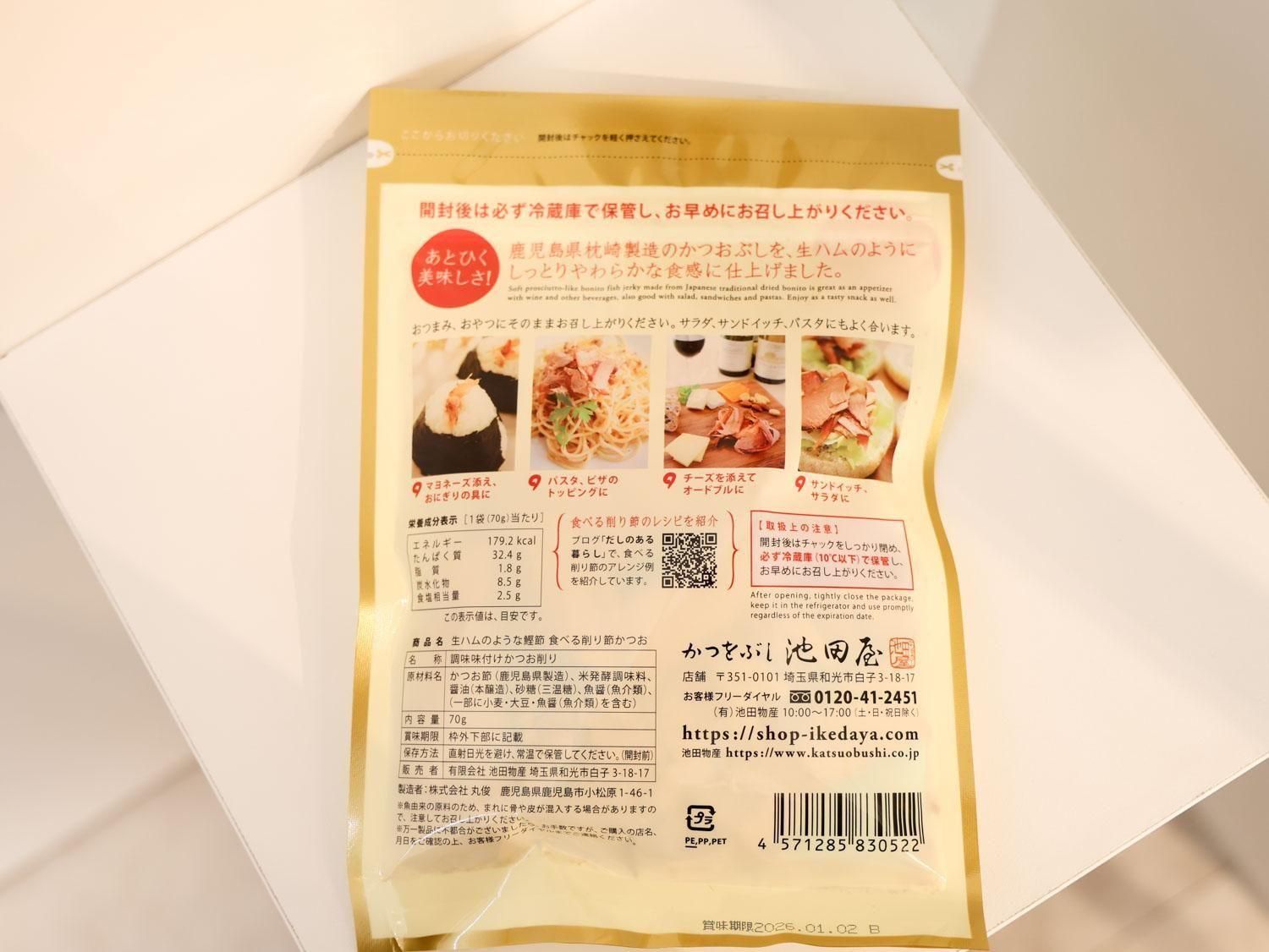 - かつお、発酵調味料、醤油(本醸造)、砂糖(三温糖)、魚醤(魚介類)、(原料の一部に小麦、大豆を含む)