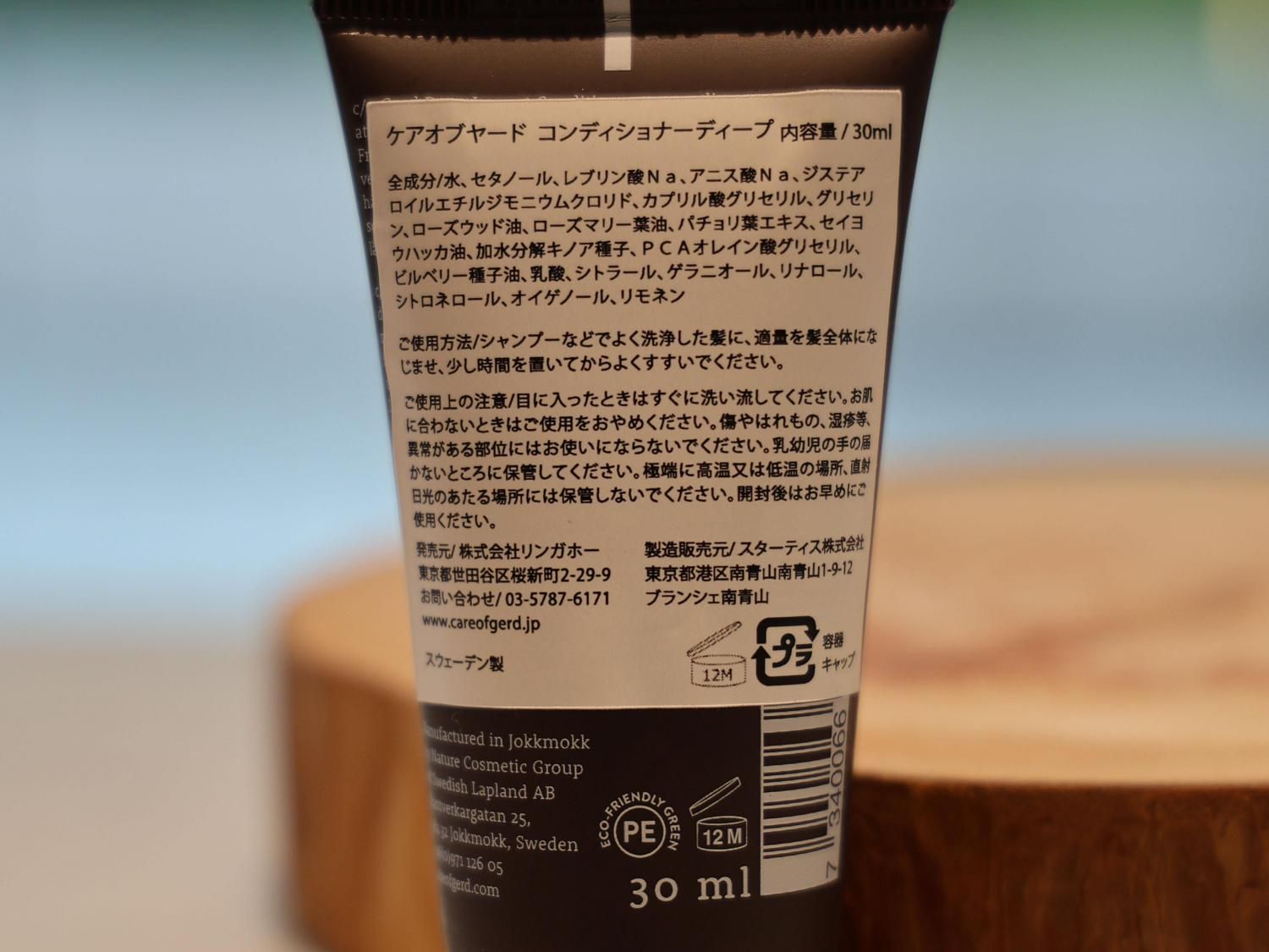 全成分:水、セタノール、レブリン酸Na、アニス酸Na、ジステアロイルエチルジモニウムクロリド、カプリル酸グリセリル、グリセリン、ローズウッド油、ローズマリー葉油、パチョリ葉エキス、セイヨウハッカ油、加水分解キノア種子、PCAオレイン酸グリセリル、ビルベリー種子油、乳酸、シトラール、ゲラニオール、リナロール、シトロネロール、オイゲノール、リモネン