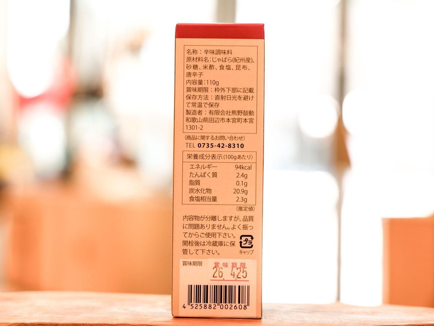 原材料 :じゃばら(和歌山県産)、砂糖(てんさい)、米酢、食塩、昆布、唐辛子