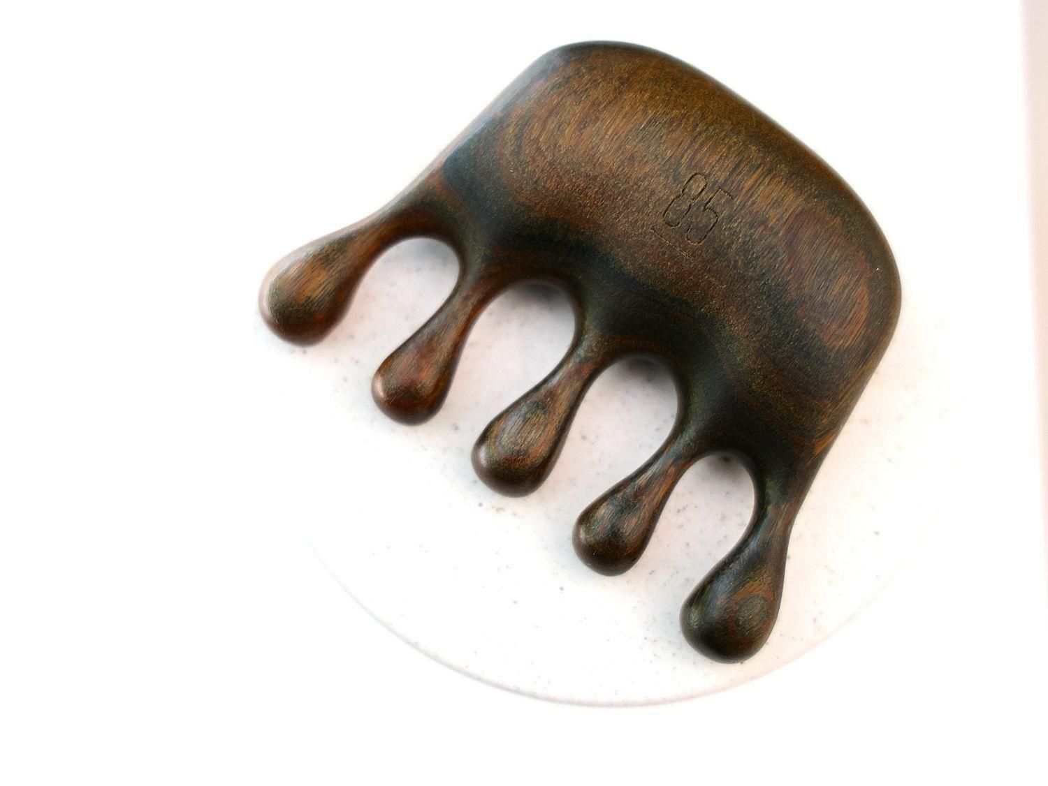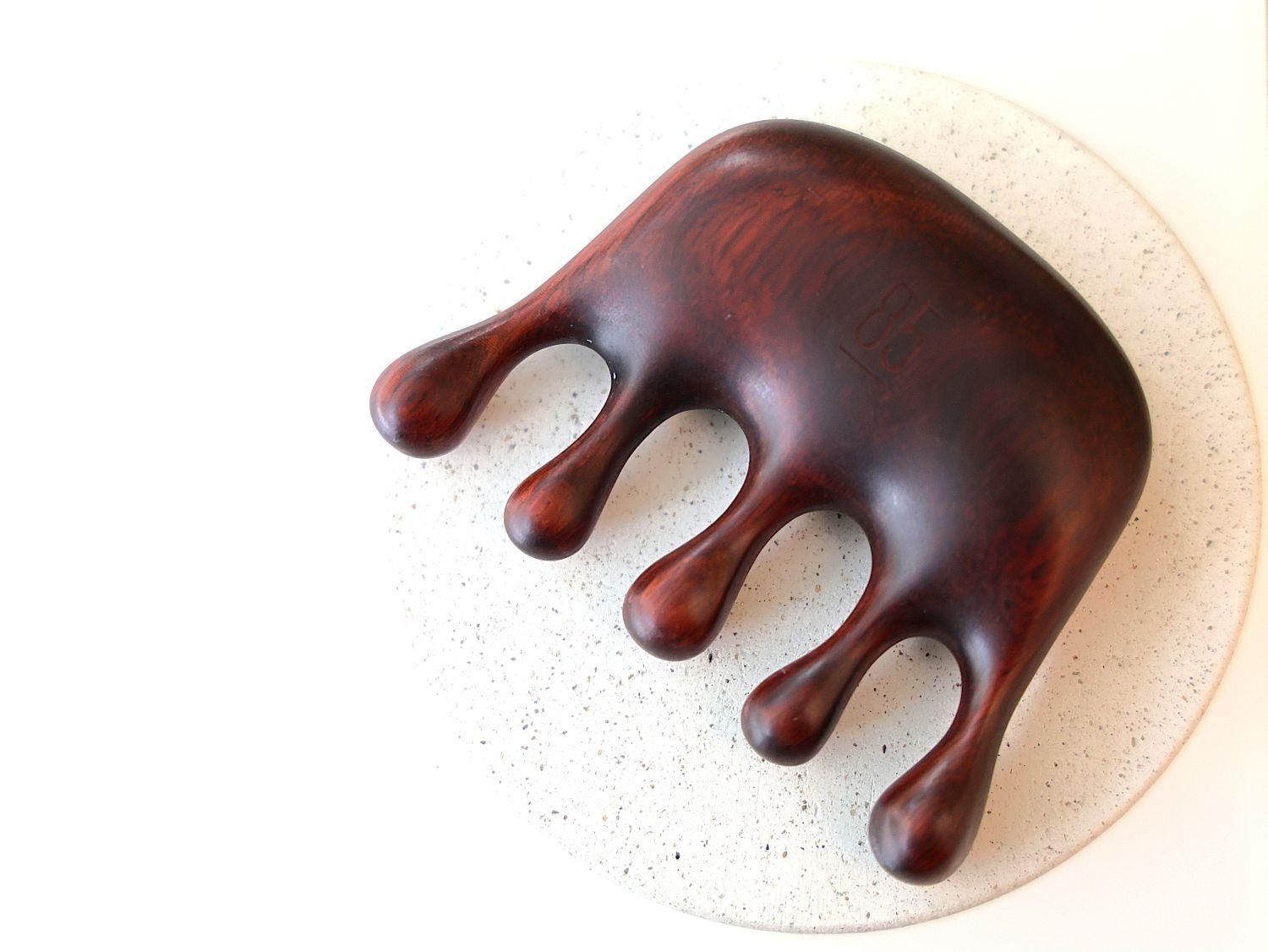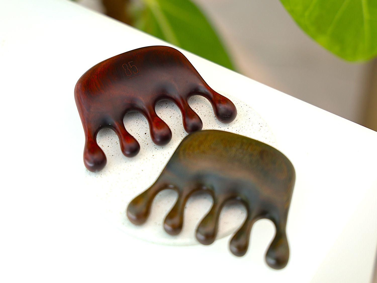 使っている木材は、表面が滑らかでマッサージに最適なサンダルウッド(白檀)です。さわやかな甘い香りを持つ貴重な香木としても知られ、蒸留して取られる精油は爽快感を与え、精神的なストレスや不安症などを和らげる効果もあると古くから言われています。インドの伝統的医学アーユルヴェーダでは心身全体を冷まして鎮める作用があるとされ循環器・消化器・呼吸器・神経系すべてに作用を及ぼすと考えられています。