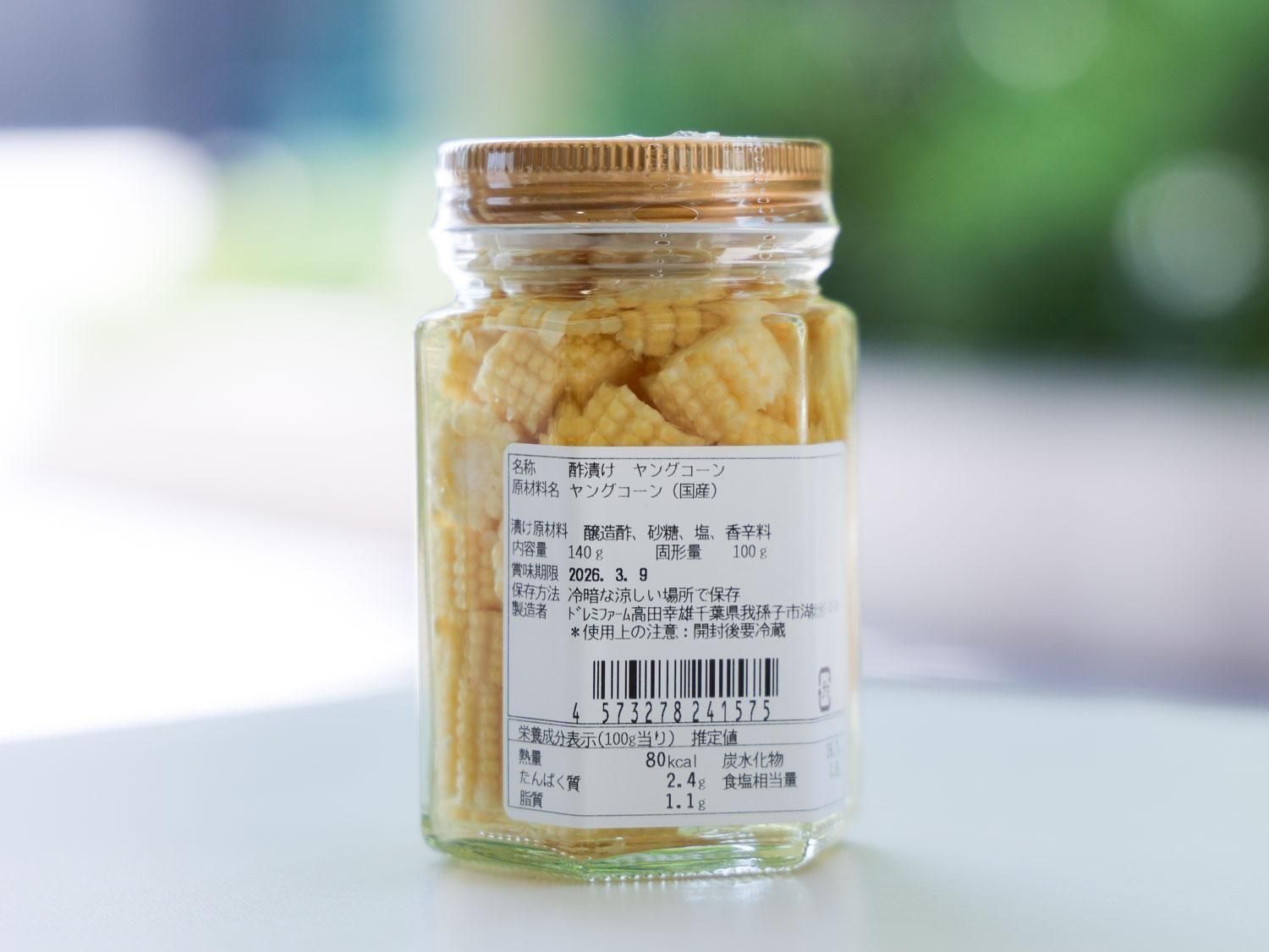 原材料名:ヤングコーン(国産) 醸造酢 砂糖 塩 香辛料