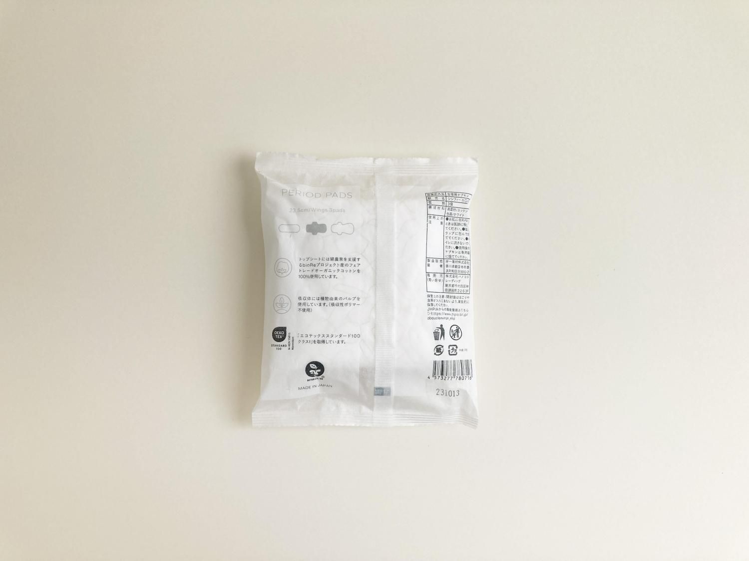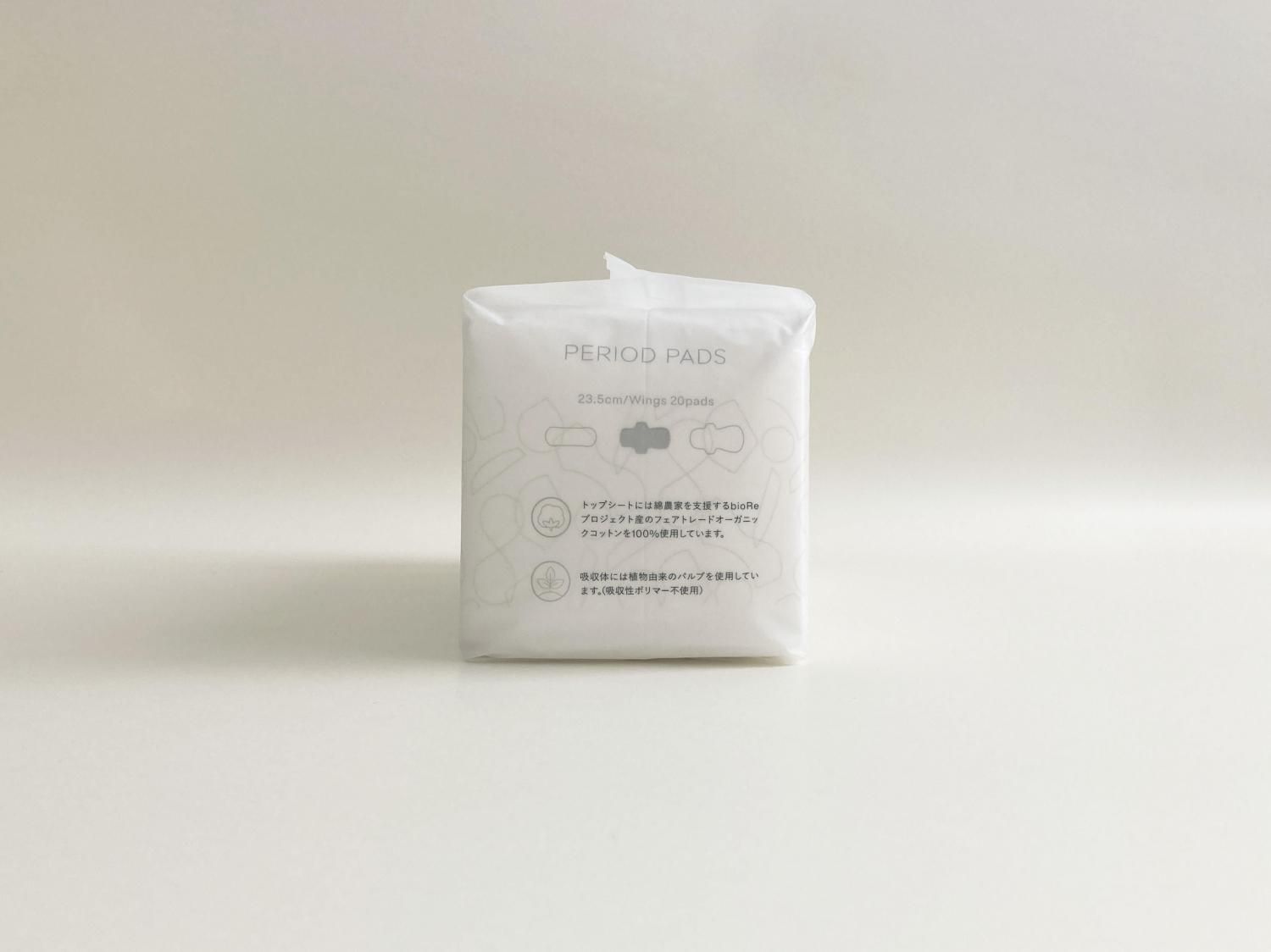 直接肌に触れる表面のシートは、オーガニックコットン100%です。吸収体は植物からできたパルプのみで、石油由来の高分子吸収体使用を使用しないノンポリマーのナプキンです。