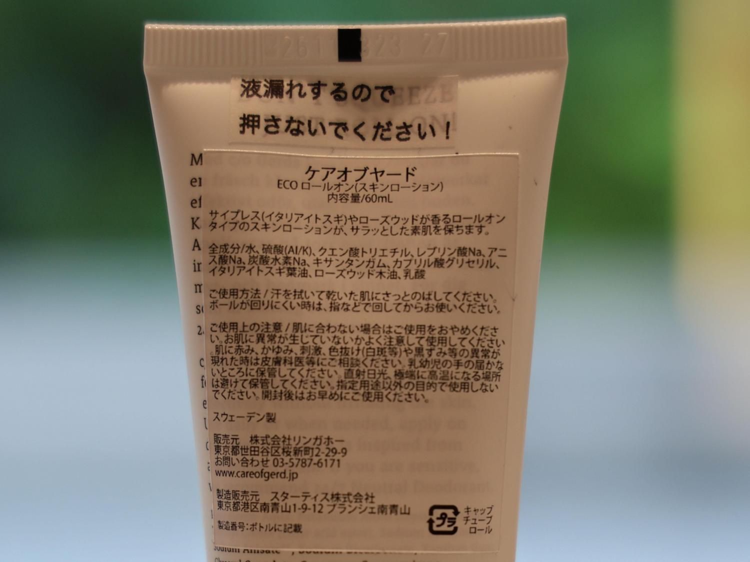 ケアオブヤードのエコデオドラント(ECOロールオン)は塩化アルミニウムは勿論、パラベンもアルコールも使いません。